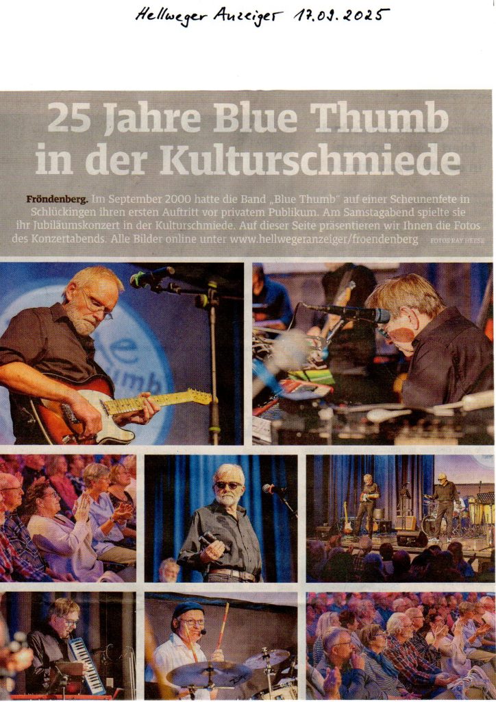 Im September 2000 (also genau vor 25 Jahren) hatte die Band „Blue Thumb“ auf einer Scheunenfete in Schlückingen ihren ersten Auftritt vor privatem Publikum. Ein Jahr später – in Fröndenberg – folgte der erste öffentliche Auftritt anlässlich einer Weinprobe im Kettenschmiedemuseum.